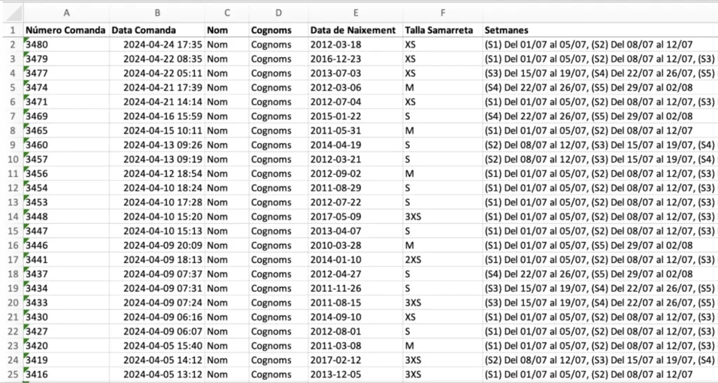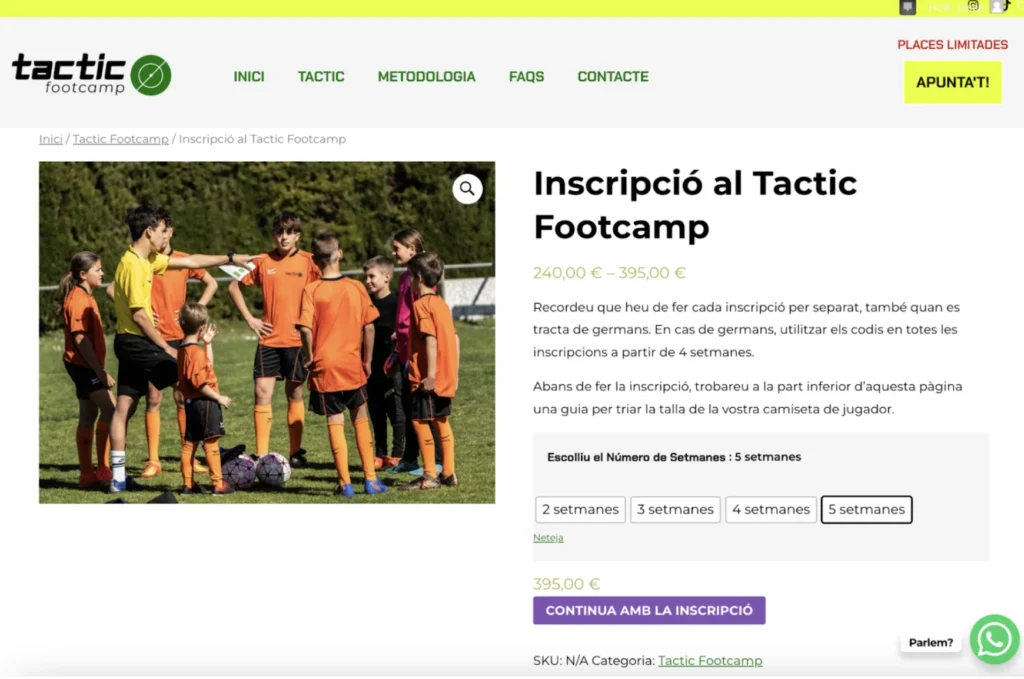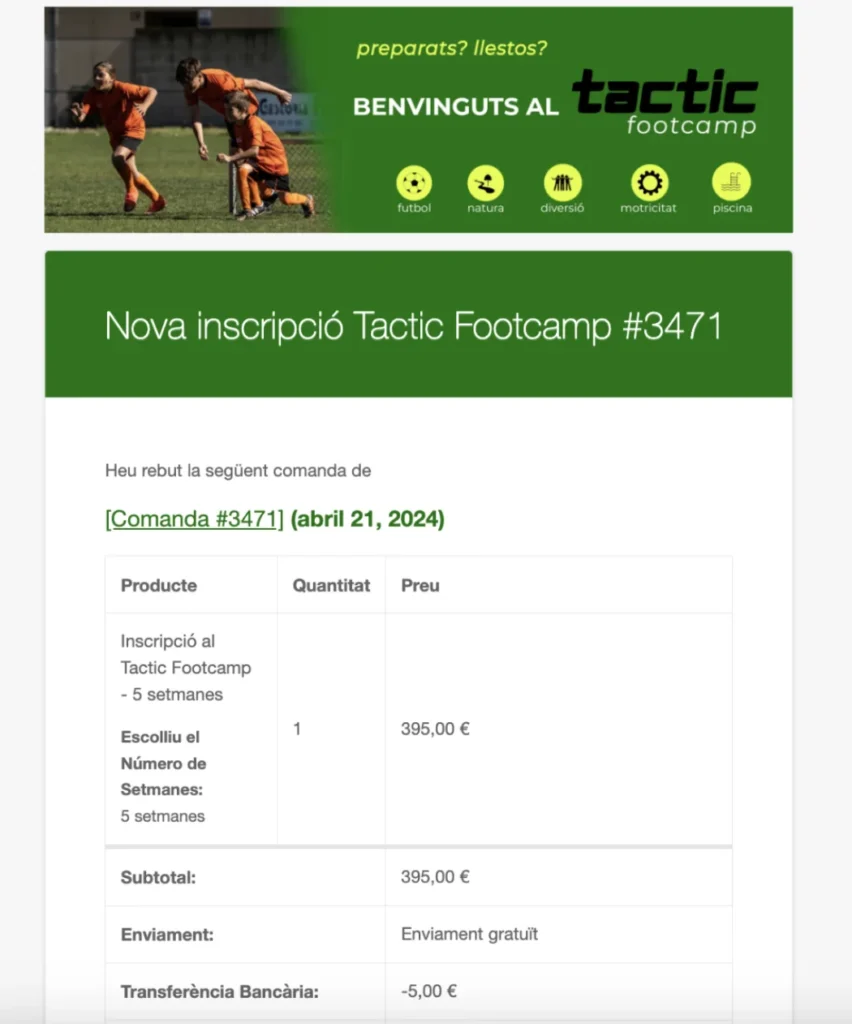Que les famílies facin la inscripció des de la teva pàgina web i paguin al moment, i també en el mateix instant et deixin totes les dades del seu fill o filla, i t’adjuntin la targeta sanitària fent una foto amb el telèfon, acceptin les bases o política i et deixin la talla de la camiseta, entre altres.