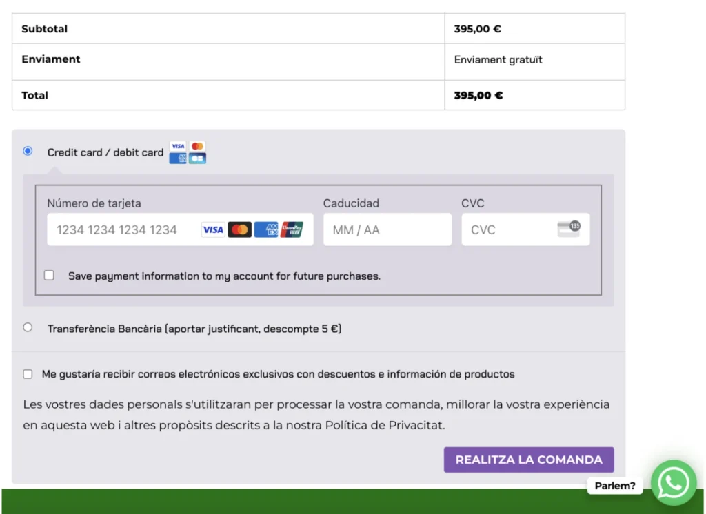 La plataforma accepta pagaments per tot tipus de targeta, i Apple Pay i Google Pay, el que facilita molt més el procés de pagament.